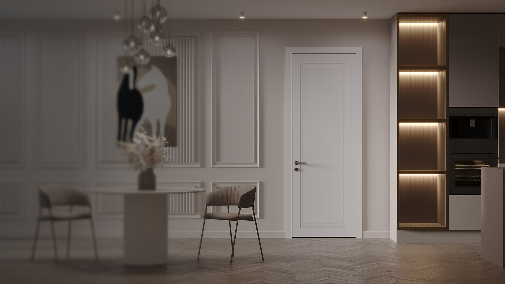 Гармоничное сочетание традиционных форм дверей и минималистичных профилей с филёнками, характерных для современного стиля.