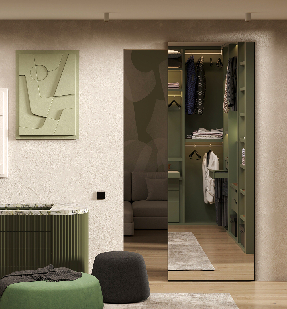 Функциональное преимущество: все подвижные механизмы скрыты внутри конструкции дверного полотна, на полу нет направляющих, что улучшает эстетическое восприятие и создает его визуальную целостность. Может использоваться как зеркало в полный рост.